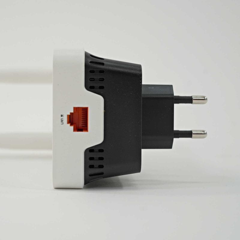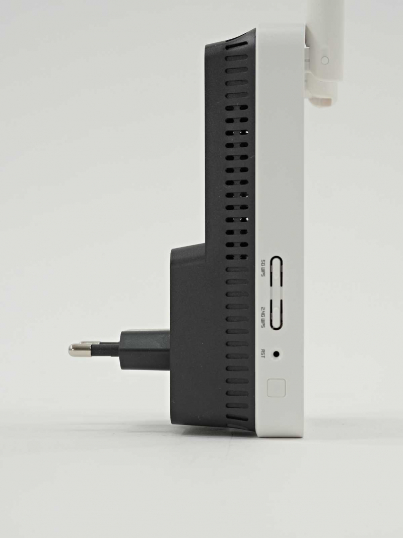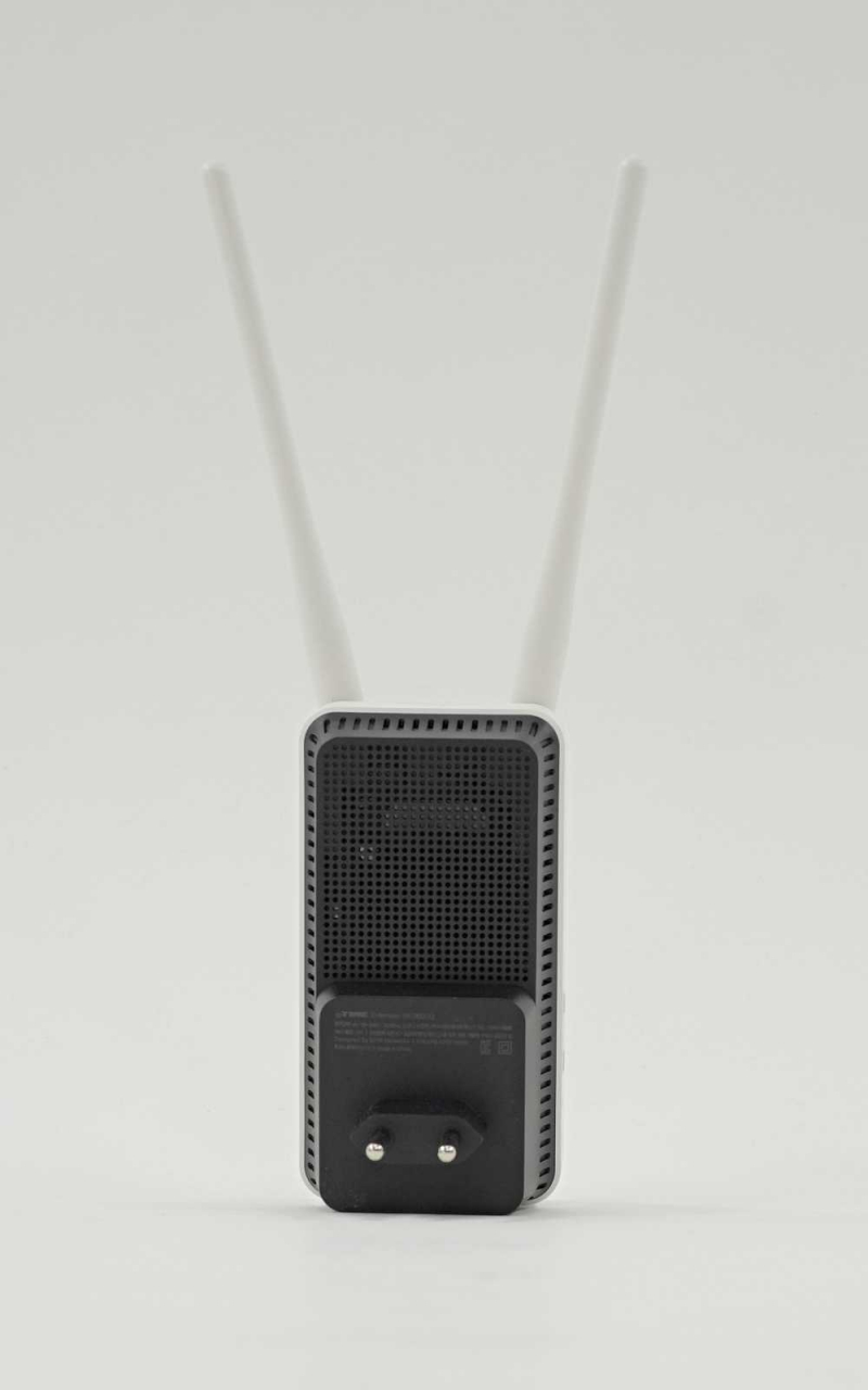 본체 하단에는 기가비트(1Gbps) 속도의 이더넷 LAN 포트가 1개 탑재되어 있다. 이 포트를 활용하면 확장기 가까이 위치한 PC나 TV, NAS 등 유선 기기를 직접 연결할 수 있다. 설정에 따라 추가 스위치 허브를 연결해 여러 유선 기기를 동시에 물려 사용하는 것도 가능하다. 외장 안테나 2개가 상단에 뻗어 있어 무선 성능을 극대화하며, 전체적인 실루엣은 군더더기 없이 간결하다.