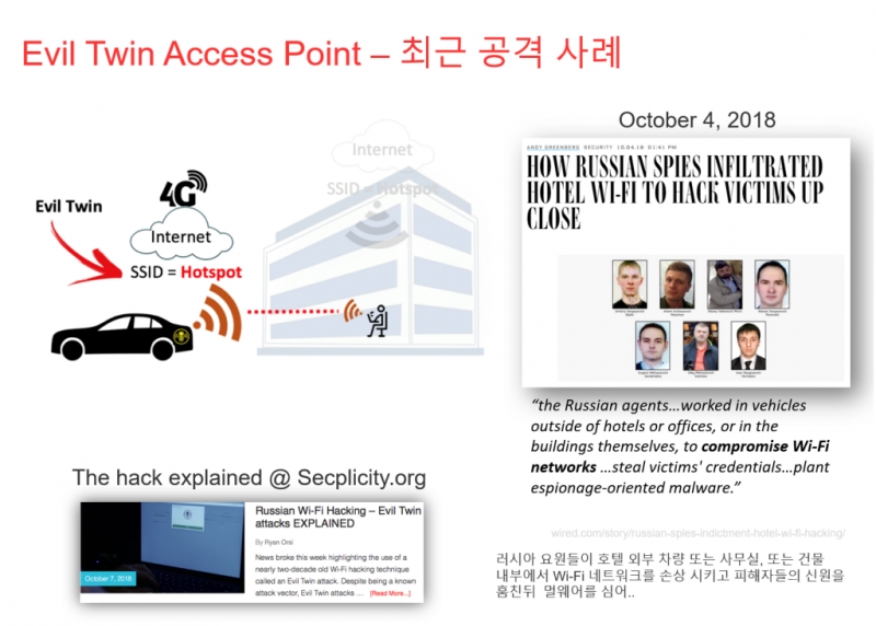 가장 긴장하게 만드는 해킹 기법은 Evil Twin AP다. 최근 러시아의 해킹그룹 GRU가 미국 법무부의 공공 와이파이 지역에 침투하면서 악명을 떨친 이 공격은 해킹 커뮤니티에서 널리 알려진 보안 공격 방식 중 하나다. 802.11 무선 네트워크를 사용해 합법적인 와이파이 액세스 포인트와 같은 SSID를 사용한다. 이 때문에 피해자의 장치가 애초에 의도했던 와이파이 장치와 연결되는 것이 아닌, 해커의 장치로 와이파이로 우회한다.