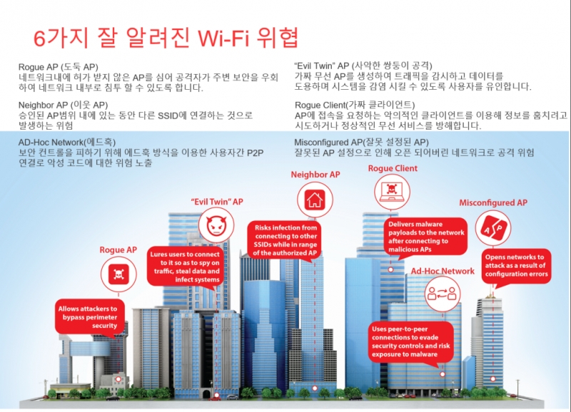 공용 와이파이 지역에서 가장 많이 이용되는 해킹 방식은 무려 6가지에 달한다. 네트워크 내에 허가받지 않은 SP를 심어 공격자가 주변의 보안을 우회해 네트워크 내부로 침투할 수 있도록 하는 Rogut AP 공격부터 최근 해커에게 가장 주목받고 있는 Evil Twin AP 공격처럼 다양하다. 이 때문에 공용 와이파이 사용 중 발생하는 문제에 대해 사용자가 알아채지 못한다.