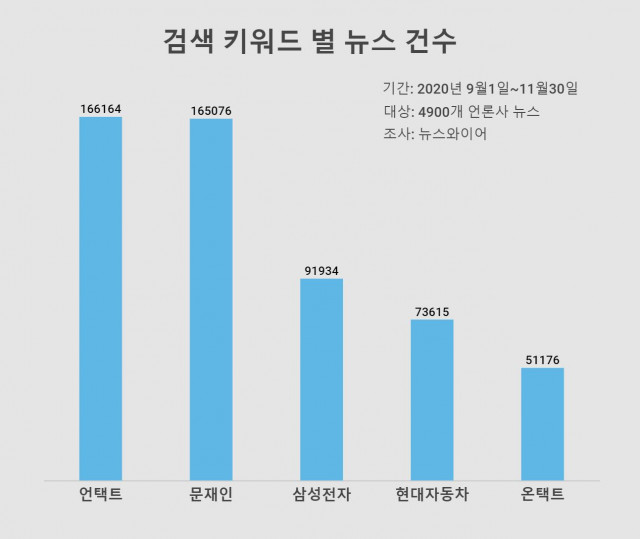 올해 9월 1일부터 11월 30일까지 3달간 신문, 방송, 온라인매체, 잡지 등 4900여 언론매체가 보도한 뉴스를 키워드로 분석한 결과다. 조사 기관인 뉴스와이어는 이 기간 동안 언택트 또는 untact가 등장한 뉴스는 16만6164개로, 대통령 이름 ‘문재인’이 나온 뉴스(16만5076개)를 앞질렀다. 언택트 언급 뉴스는 삼성전자(9만1934건)와 현대자동차(7만3615건)가 등장하는 뉴스를 합친 숫자와 맞먹었다고 설명했다.
