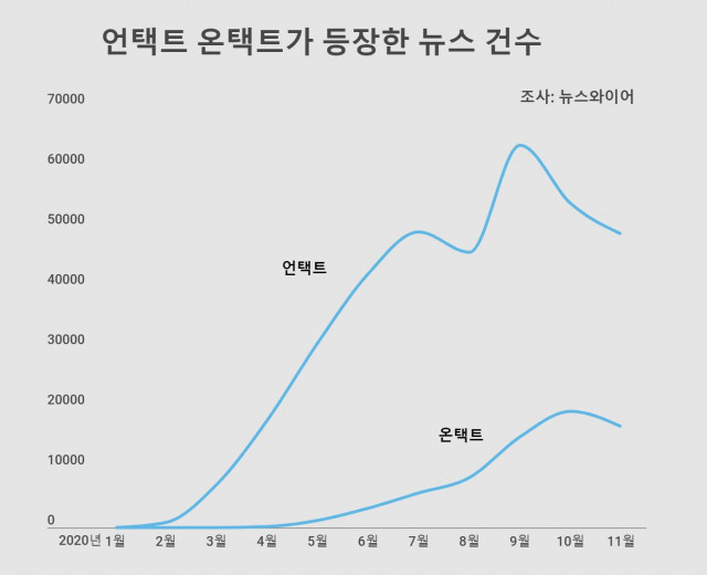 언택트 단어가 포함된 뉴스 건수는 2018년 1010개, 2019년 1841개였으나, 올 들어 코로나 유행 이후 급증하기 시작해 11월말까지 무려 35만9699개 뉴스에 언택트 단어가 사용됐다. 이는 전년보다 200배나 증가한 수치이다.