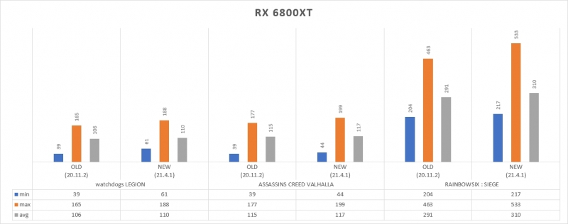 그래픽 성능 비중이 높은 환경이라면 성능 향상 가능성은 분명하다. 3D 마크를 시작으로 포토샵 같은 프로그램에서의 성능 또한 소폭 향상됐다. 단연 두각을 보인 부분은 게임이다. 최대 프레임 향상은 RX 6800과 6800XT 두 제품 모두에서 공통으로 목격됐다.
