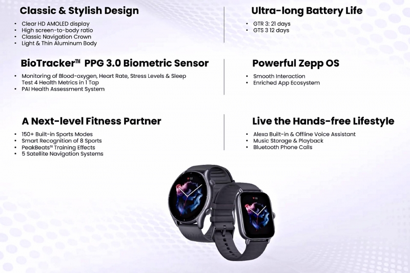 GTR3 는 긴 사용시간이 핵심이다. 절전모드 기준에서 한 번의 충전으로 최대 35일 연속 사용할 수 있는 배터리 효율을 갖췄다. 일반 사용 시에도 최대 21일간 구동한다. 1.39인치 아몰레드 HD 디스플레이를 적용했다. 편한 착용감에 비중을 높인 GTS 3는 사각형 1.75인치 아몰레드 울트라 HD 디스플레이를 장착했다. 스마트워치 중 최대인 72.4%의 넓은 화면 비율을 내세웠다. 무게도 24.4g으로 가볍다.