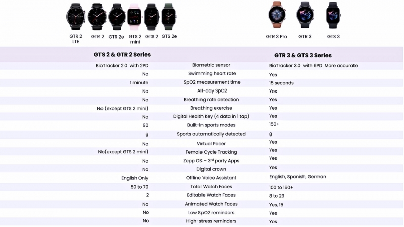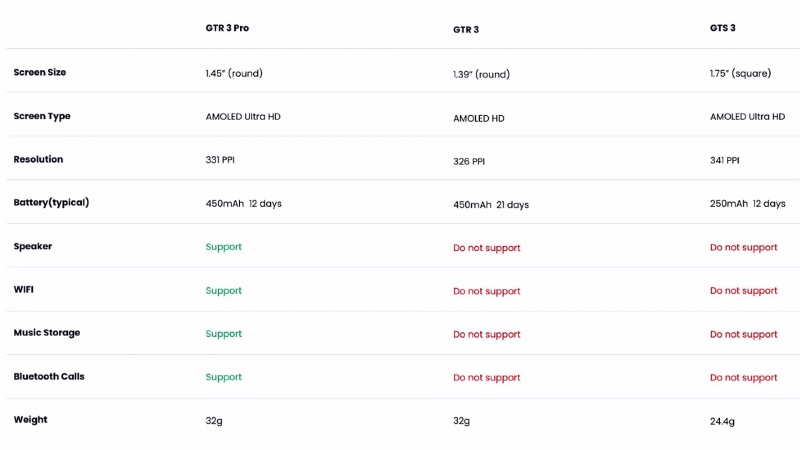 라인업은 3종이다. 강력한 기능을 앞세운 GTR 3 프로와 긴 사용시간을 보장하는 GTR 3, 그리고 편한 착용감을 주는 GTS 3로 나뉜다.