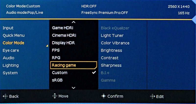 기본 제공하는 HDRi 설정도 충분하지만, 사용자에 취향에 맞게 세부사항을 추가로 조정하면 더 나은 만족을 꾀할 수 있다. 블랙 이퀄라이저 기능을 활용하면 게임 화면의 어두운 부분만을 식별이 용이한 수준으로 조절할 수 있거니와, 라이트 튜너를 이용해 영상의 지연이나 역 잔상 없이 밝기와 대비, 채도 등을 취향에 맞게 조절할 수도 있다. 컬러 바이브 런스가 화면의 채도를 20단계로 나누기에 디테일한 설정도 문제없다.