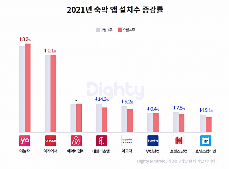 선두 플랫폼과 글로벌 OTA(온라인 여행사) 간 격차는 더 확대됐다. 연초 대비 1,2위 설치 수는 소폭 증가한 반면, 그 외 앱은 변동이 없거나 감소폭이 컸다. 1월 첫째 주 대비 9월 넷째 주 1위 플랫폼 설치 수는 3.2%, 2위는 는 0.1% 늘었다. 같은 기간 △호텔스컴바인은 설치 수가 15.1% 줄었으며, △데일리호텔은 14.3%, △아고다는 9.2%, △호텔스닷컴은 7.5% 감소했다.