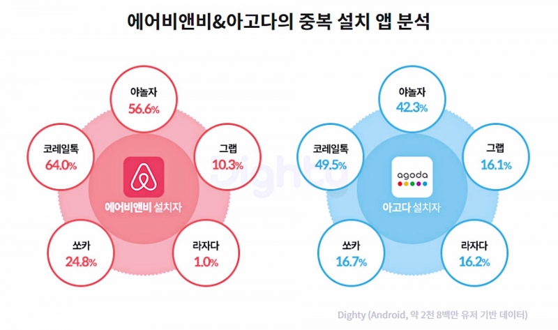 여러 개 숙박 앱을 동시에 쓰는 이용자도 많았다. 특히 1위 플랫폼 △야놀자를 함께 설치한 비율이 높았다. △에어비앤비 설치자 중 절반(56.6%)이, △아고다 설치자의 42.3%가 △야놀자를 설치한 것으로 집계됐다.
