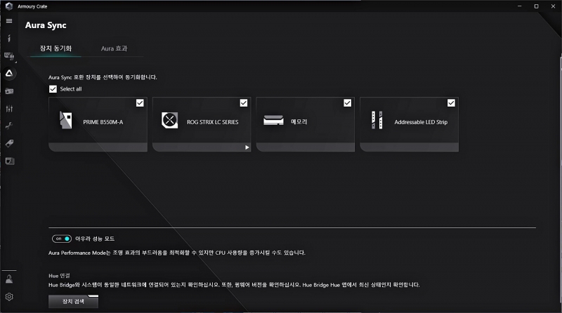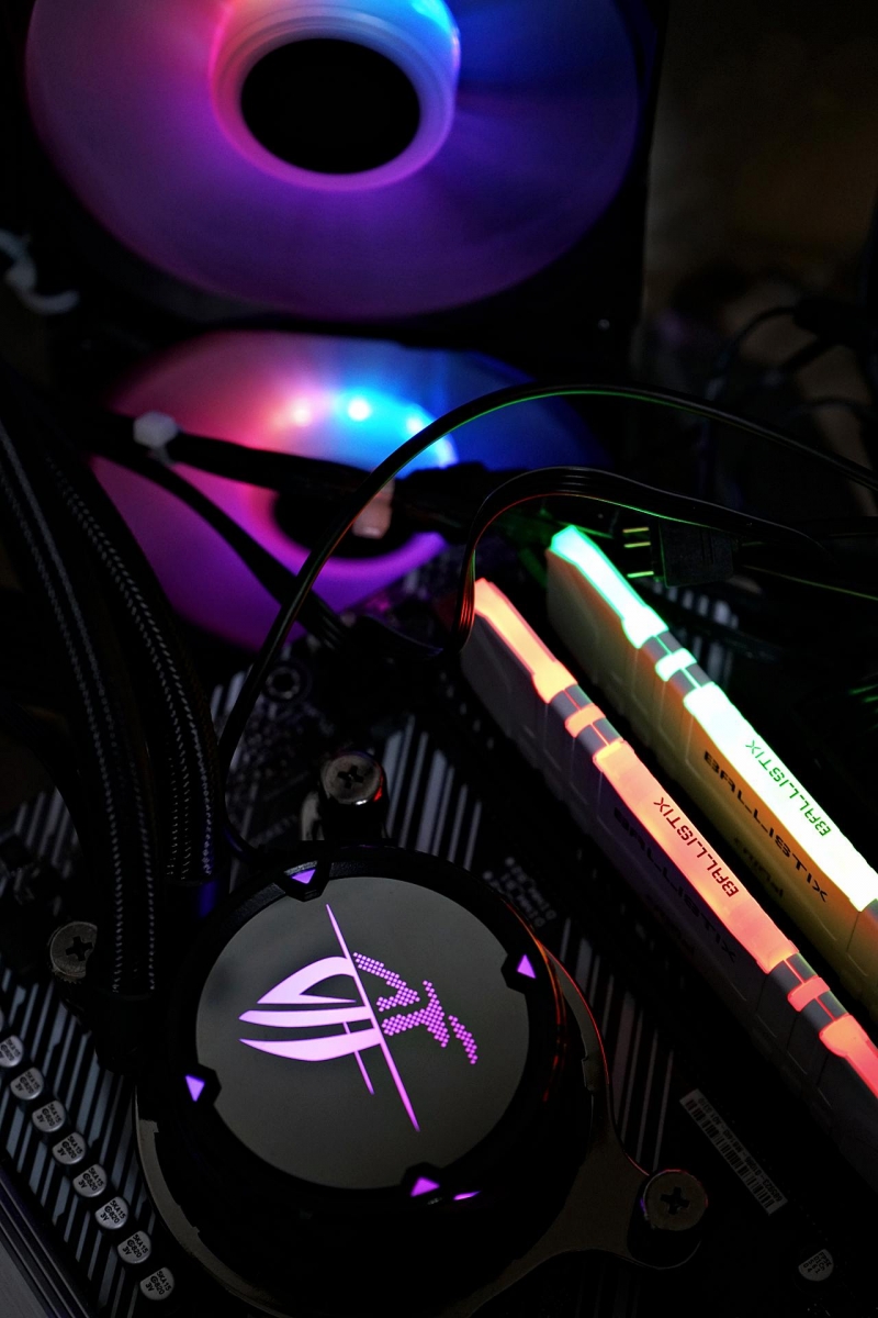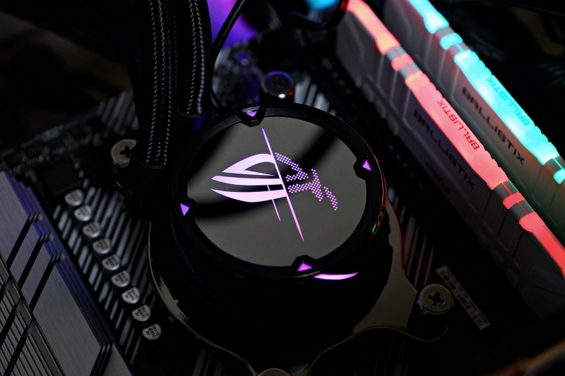 펌프 커버의 LED ROG 로고가 선명한 위용을 드러내며, RGB 라디에이터 팬은 에이수스의 Aura Sync를 사용해 다양한 커스터마이징이 가능한 조명 효과를 지원한다. 이 때문에 사용자 취향에 맞게 완전히 새로운 느낌의 본체 연출을 자유자재로 할 수 있다. RGB 연동 기능 하나면 PC 전체의 발광 효과를 조절할 수 있다. 감성적인 측면이지만 게이머 입장에서는 핵심 기능일 수도 있는 부분이다.