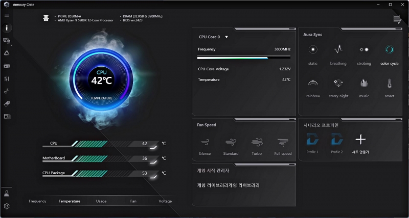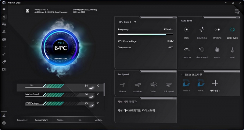 최대 64도, 최저 42도라는 온도는 수냉 쿨러를 왜 사용해야 하는 가에 대한 직접적인 설명이 된다. 너무 낮아도 너무 높아도 안 되는 시피유라는 전자 제품을 상대로 동작에 적합한 온도를 일정하게 유지하는 것이 바로 우리가 수냉 쿨러를 구매하는 근본적인 이유다. 조더구나 크게 거슬리지 않는 소음이라면 더할 나위 없이 만족할 조건이다.