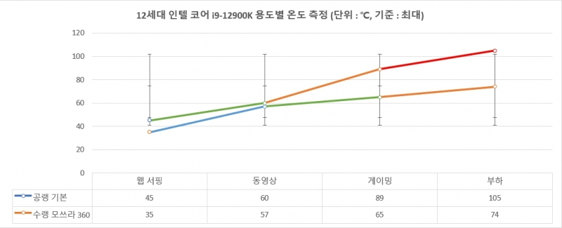 △ 12세대 코어 i9-12900K 시스템으로 온도를 체크해본 결과 부하가 걸린 환경에서 최대 온도는 74도 수준에 머물렀다. 온도 관리 측면에서 모쓰라 360 쿨러는 매우 우수한 쿨링 성능을 제공한다.