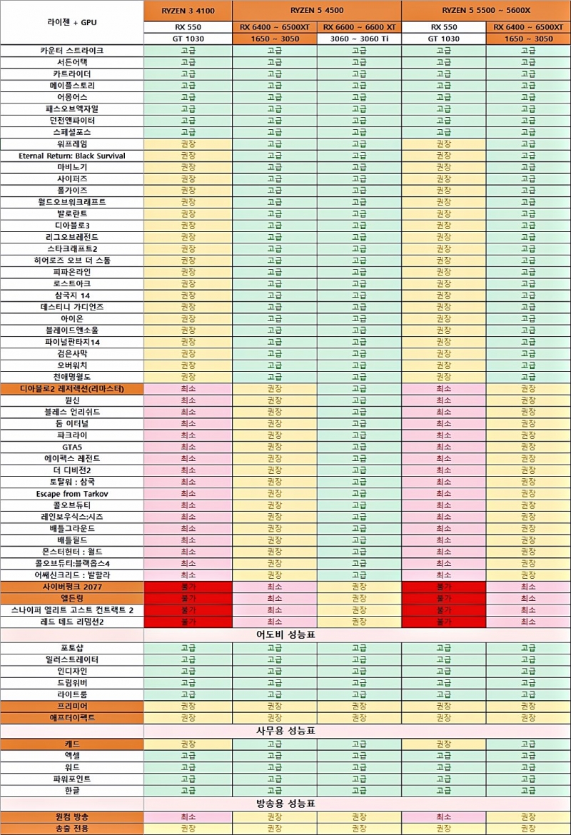그래픽카드 조합은 라데온과 엔비디아 그리고 내장 GPU 사용 3가지 형태를 고려했다. 그래픽카드는 엔비디아와 라데온 그래픽카드 둘 다 가운데, RTX 6,000시리즈, , 라데온 그래픽카드는 최근 출시된 6,600시리즈까지 포함해 22년 06월 기준 시장에서 사용자가 구매할 수 있는 모든 선택지가 모두 포함된 테스트 결과자료다. 물론 모든 사용자에게 해당 장표가 명확한 해답이 되지는 않겠지만 PC 조립에 참고할 자료로써 22년 06월 기준 가장 방대하고 모든 가능성을 내포한 최신판이라는 사실은 부인할 수 없다.
