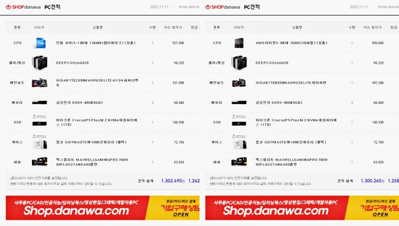 ▲가격 비교 서비스 다나와에서 동일한 130만 원대 예산으로 시스템 견적을 뽑았다. 하지만 이들 제품을 가지고 3년 뒤 업그레이드 가능 유/무는 다를 가능성이 높다. AM5 소켓은 오는 25년 까지 제품 출시를 약속했다. 기업은 동일한 시스템 환경에서 시피유 교체만으로 성능을 높일 수 있다. 이는 투자 비용 상당부분 절감을 의미한다.