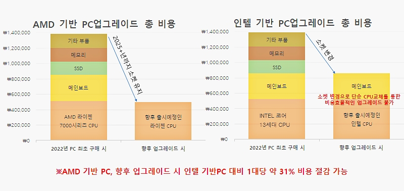 업그레이드에 유리한 AMD 플랫폼 기반 라이젠 7000 시리즈는 AM5 소켓을 사용하는데, 해당 제품은 AMD에서 공식적으로 오는 2025+년 까지 지원을 약속했다. 이전 세대 소켓인 AM4의 경우 5년 이상 지원했기 때문에 2025년을 기점으로 이후까지 몇 년 더 소켓에 활용 가능한 제품 출시가 이뤄질 전망이다.