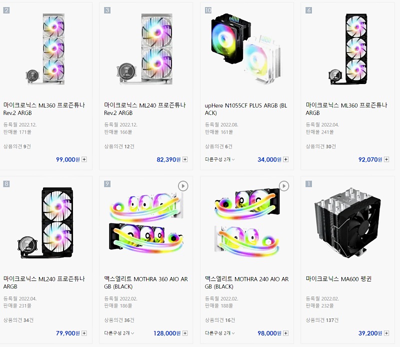 13세대 인텔 코어 시피유는 LGA1700 소켓을 사용하며, 쿨러도 이에 대응해야 사용할 수 있다. 그리고 화이트색상이라는 조건 충족이 관건이다. 가격 비교 서비스 다나와에서 화이트 색상 쿨러를 검색하면 다양한 브랜드 제품이 리스트에 나온다. 추천하자면 마이크로닉스와 맥스엘리트가 유통하는 제품이 품질, 성능 마지막으로 A/S 부분에서 좋은 평가를 받고 있다.