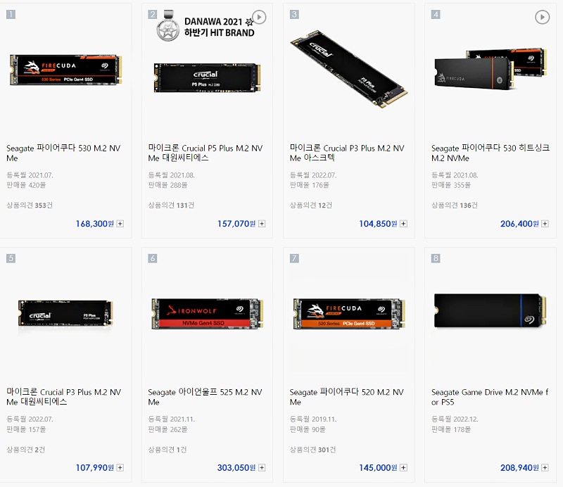 ▲ 다나와에서 검색해본 NVMe M.2 스토리지 (추천하는 제품은 대원CTS가 공급하는 마이크론 P5+)