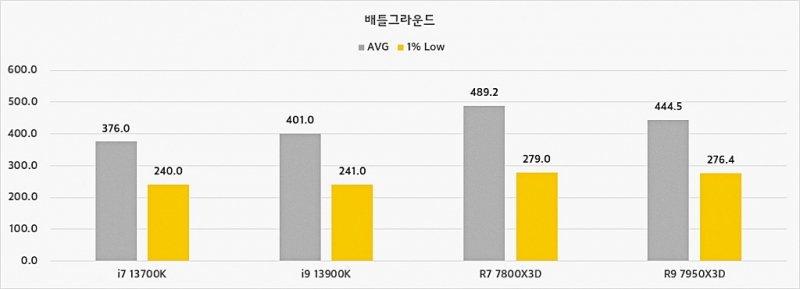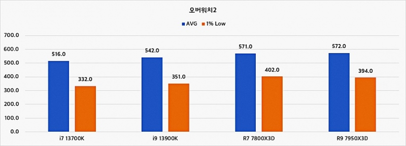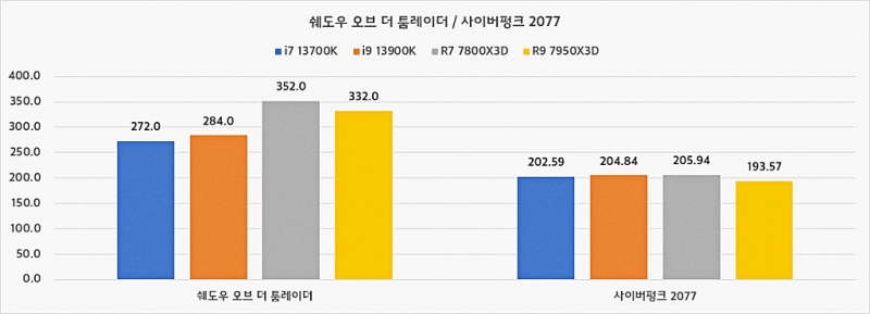 하지만 환경이 게임으로 옮겨지면 결과는 7800X3D의 완승이다. 심지어 7950X3D 보다 나은 성능으로 측정된 부분도 포착됐다. 물론 이의 원인은 발열관리 미흡으로 추정된다. 아무래도 고 클럭으로 구동하는 플래그십 시피유 특성상 발열을 제대로 식히지 못하면 성능을 일시적으로 낮추는 경우가 있다.