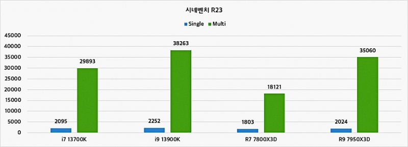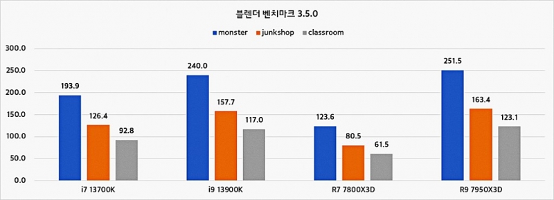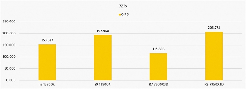 게임은 오버워치2, 배틀그라운드, 로스트아크, 쉐도우 오브 더 툼레이더, 사이버펑크 2077을 통해 성능을 측정했고, 렌더링은 블랜더와 시네벤치를 사용했다. 일반 연산으로 7Zip을 추가했다. 렌더링 부분에서 블렌더와 시네벤치 결과에 따르면 블렌더는 7950X3D, 시네벤치는 13900K 제품 성능이 우수하게 측정됐다.