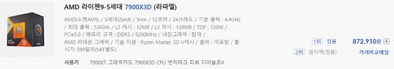 7900X3D - 12C/24T / 4.4~5.6GHz / 140MB / TDP 120W / TDP 120W / 89℃