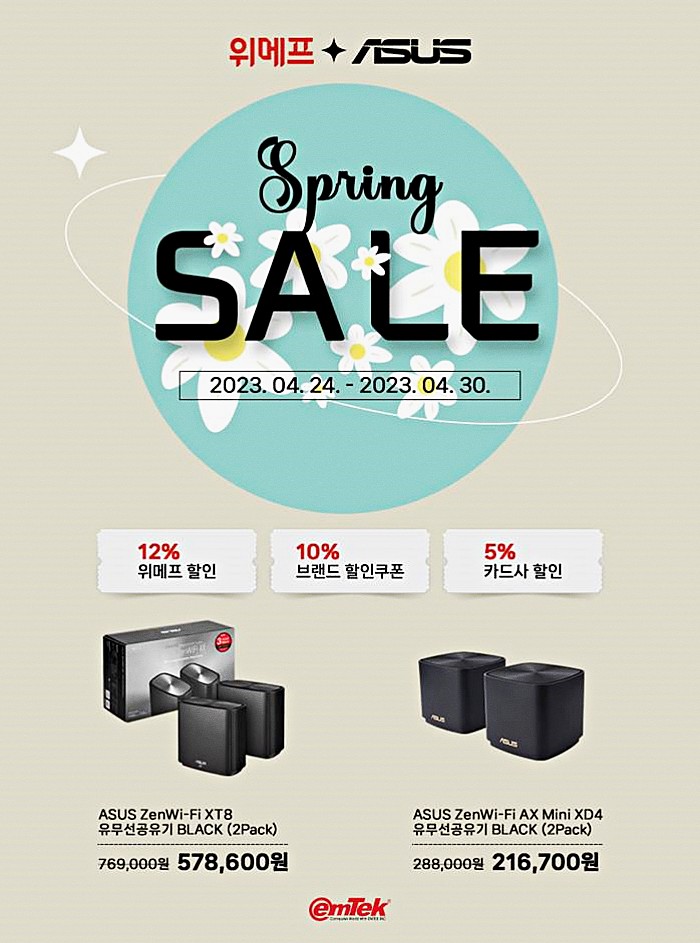 이엠텍이 오는 4월 30일까지 ASUS Mesh 와이파이 공유기 제품을 최대 25% 할인하는 스프링 세일 프로모션을 진행한다. 위메프 단독으로 진행되며 오픈마켓 최저가 보다 저렴한 가격으로 단 7일 한정 수량 판매된다.
