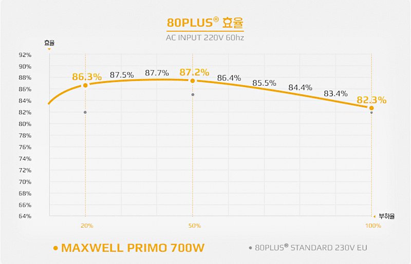 이런 개선 덕분에 보급형파워 서플라이로는 상당히 우수한 전압 정확도와 효율을 달성했다. 맥스엘리트가 공개한 자료에 따르면, 프리모 시리즈의 12V 출력은 부하에 관계없이 4% 이내로 정확하게 제어된다고. 효율 역시 80Plus Standard를 훌쩍 뛰어 넘는 수준을 확보하고 있다. 조립 시의 편의성뿐 아니라 출력 특성과 효율, 내구성에서도 상당한 수준에 이르러 있는 제품이라는 점이 확인된다.