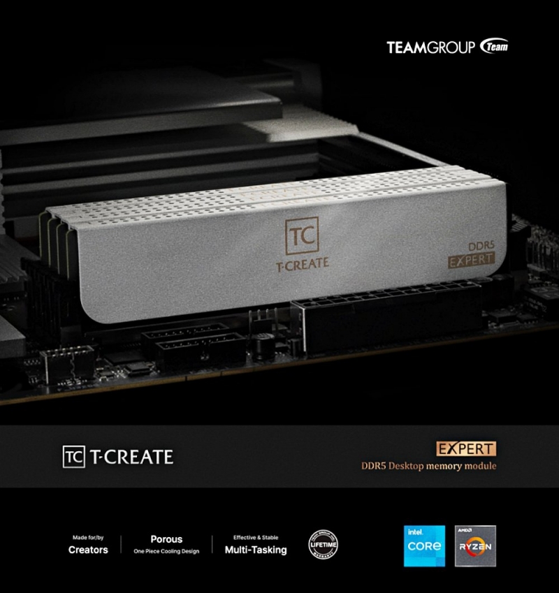 복잡한 디자인 없이 티크리에이트 로고, DDR5, 익스퍼트 시리즈만 표기되었으며, 히트싱크 상단은 균일한 벤트(Vent) 홀 디자인해 메모리 모듈에서 발생하는 발열을 열전도성이 뛰어난 알루미늄 소재의 히트싱크가 빠르게 배출할 수 있도록 기능적인 부분까지 고려했다.