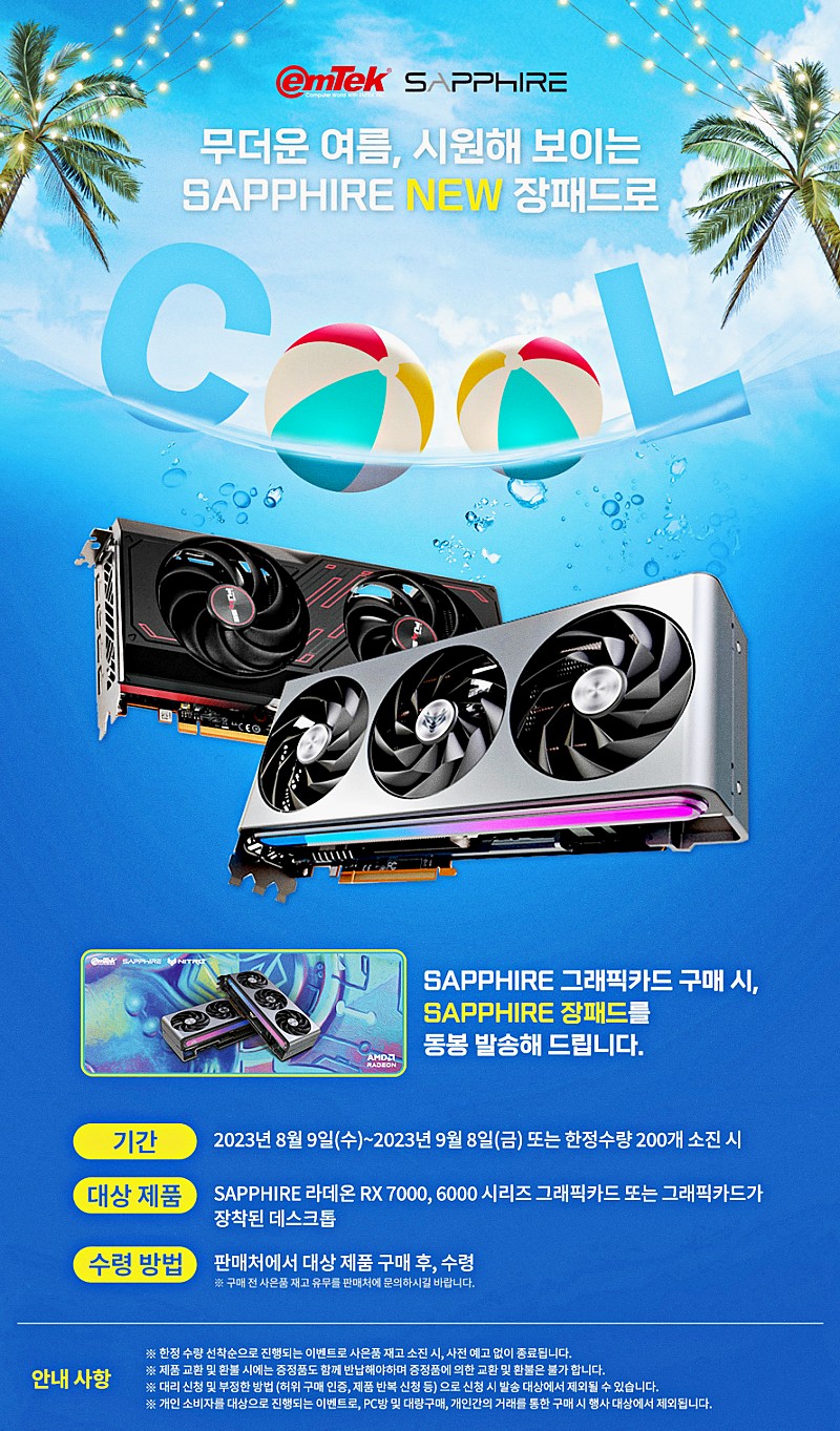 이엠텍아이엔씨가 9일부터 내달 8일까지 SAPPHIRE 라데온 RX 7000, 6000 시리즈 그래픽카드 구매자 전원을 대상으로 SAPPHIRE 장패드 추가 지급 프로모션을 진행한다. 단, 준비된 경품 수량 소진시 행사는 자동 종료되는 조건을 내걸었다.