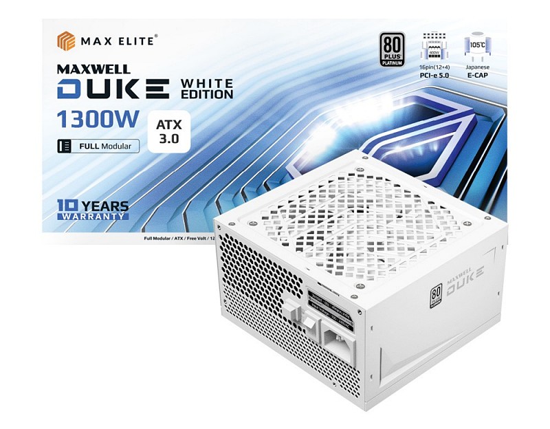 맥스엘리트가 MAXWELL DUKE 1000W∙1300W 80PLUS PLATINUM 풀 모듈러 ATX 3.0 White 전원공급장치를 출시했다. 아울러 듀크 화이트 시리즈 출시에 발맞춰 모든 듀크 시리즈의 가격을 한시적으로 인하하기로 결정했다.