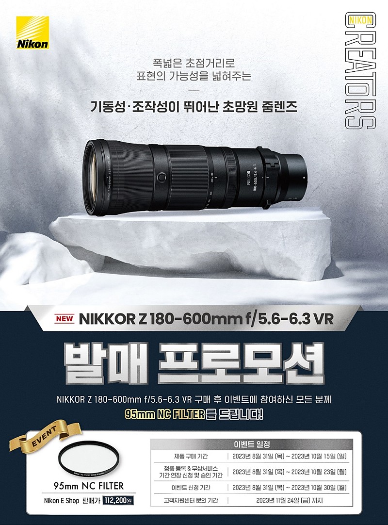 니콘 미러리스 카메라용 초망원 줌 렌즈 NIKKOR Z 180-600mm f/5.6-6.3 가 출시됐다. 이와 함께 출시 기념 프로모션이 진행된다. 제품을 구매한 고객에게 렌즈 보호 필터인 NC 필터 95mm(니콘 E shop 판매가 약 11만원 상당)를 지급하는 행사다.