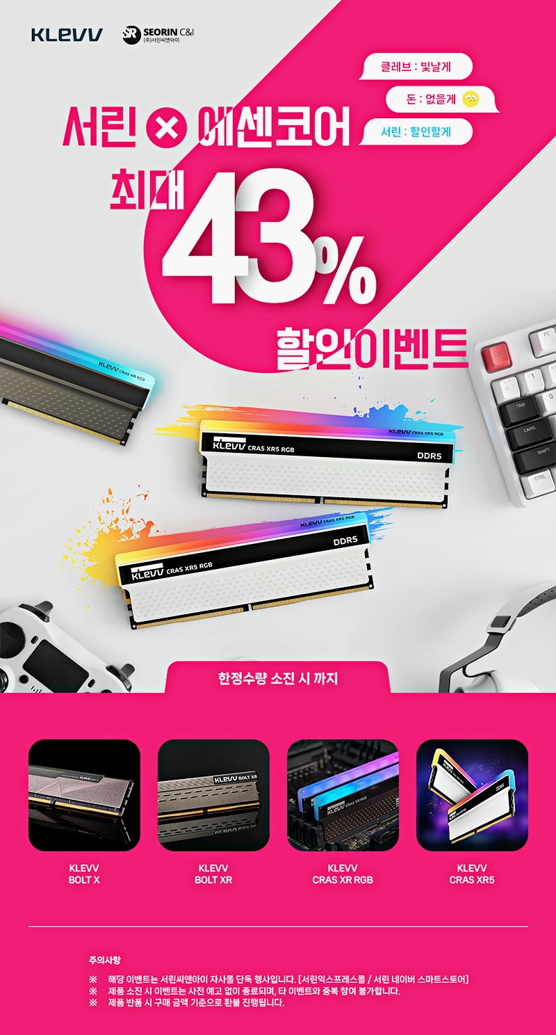 PC메모리 할인 판매는 DDR4 규격 볼트(BOLT) X와 볼트 XR, 크라스(CRAS) XR RGB 3종과 DDR5 규격 크라스 XR5 제품이 대상이다.