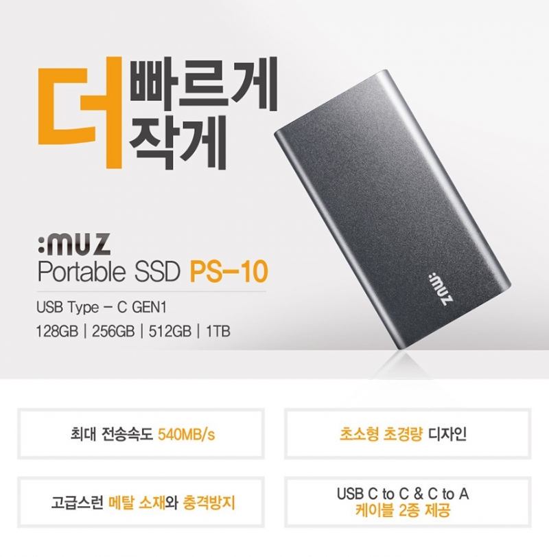 [2019년 06월 18일] - 주변기기 브랜드 아이뮤즈(대표 최우식)가 USB-C 인터페이스 기반 외장형 SSD 스토리지 PS-10을 오는 20일 출시한다고 밝혔다. 로즈골드 128GB/ 다크그레이 256GB/ 블랙 512GB/ 블랙 1TB까지 색상별로 총 4가지 용량 구성이다. 반도체 기반 스토리지를 사용해 외부 충격에 강하고, 저전력 동작 및 휴대성이 기존 외장하드 대비 우수하다.