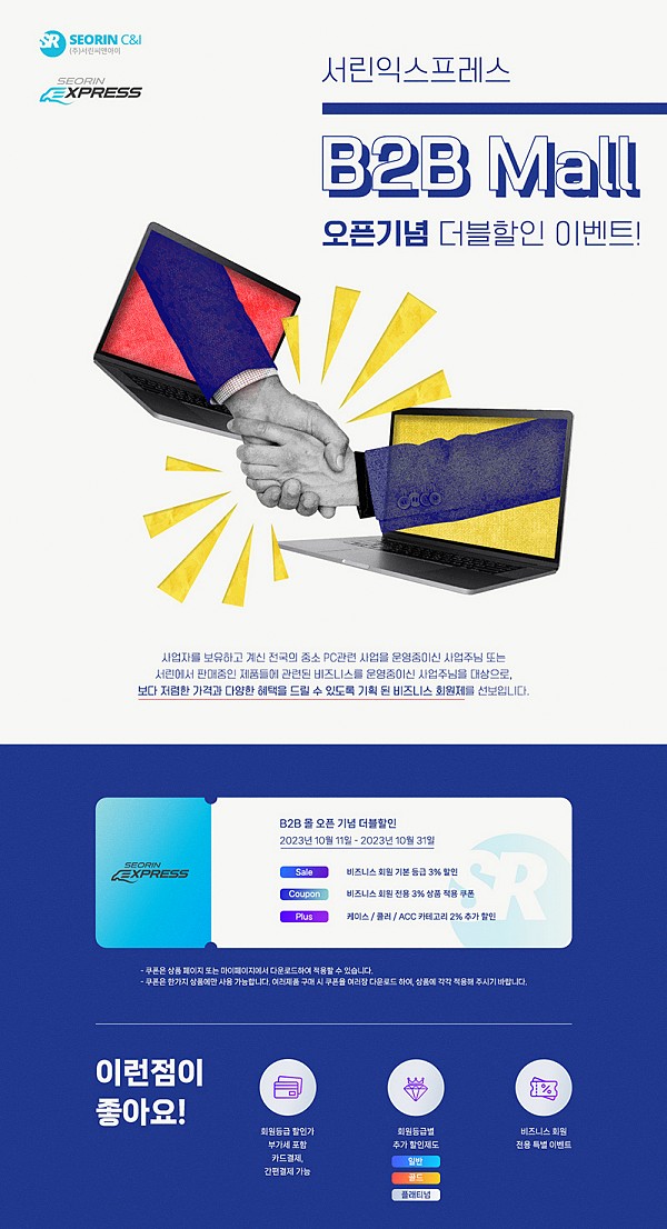 박준석 서린씨앤아이 과장은 "B2B몰은 구매 금액에 따른 회원 등급 차등으로 추가 할인 제공, 카드, 현금, 간편 결제 등 모든 결제 방식에 부가세를 포함한 동일한 판매 금액 제공, B2B 회원 전용 특별 이벤트 등 다양한 혜택들을 준비하고 있다"라고 밝혔다.