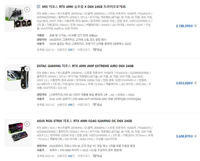 △ 게이머가 선망하는 RTX 4090을 사야 한다면 300만 원을 가볍게 넘긴다. 그나마 조텍 게이밍 지포스 시리즈가 305만 원으로 ASUS나 MSI 대비 제일 가성비가 좋다. 사실상 PC 본체 가격을 넘어서는 금액을 더해야 그래픽카드 한 장을 구매할 수 있다.