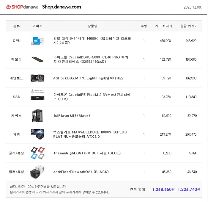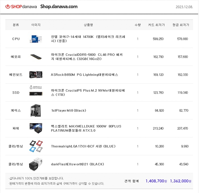 이쯤 되면 의구심 한 가지가 남을 수 있다. "도대체 그래픽카드가 얼마나 비싸길래?" 내장 GPU를 이토록 빨아준다는 건가!! 는 정도 아닐까 싶다. 답을 찾고자 23년 12월 첫 주 기준 PC 한 대 구매에 필요한 비용을 친절하게 공개한다. 먼저 부품 선정에는 지극히 개인적인 사심을 듬뿍 담았음을 밝힌다. 여기에 대해 가타부타할 필요가 없는 것이 PC 구매에는 개인적인 취향 그리고 선호하는 브랜드에 좌우됨이 현실이다.