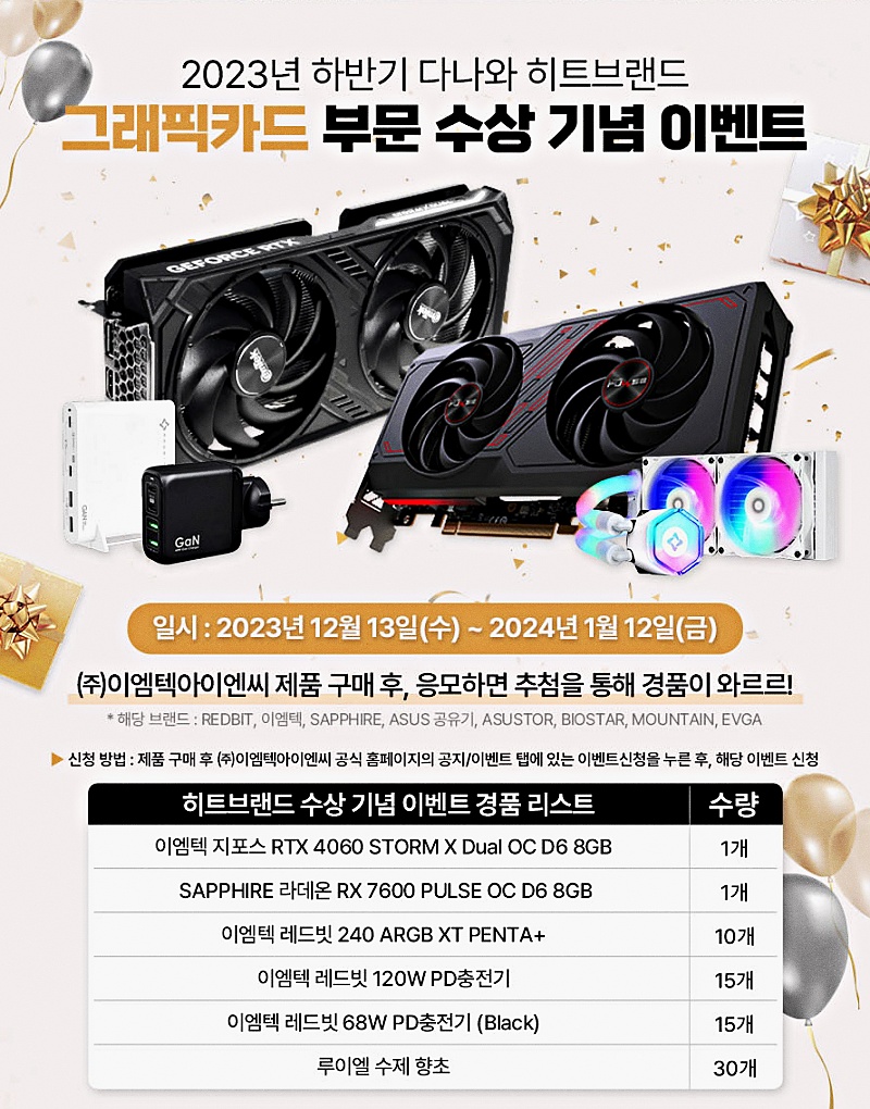 토종 그래픽카드 기업 이엠텍아이엔씨가 2023년 다나와 하반기 히트브랜드 그래픽카드 NVIDIA, AMD 부문을 동시 수상했다고 밝혔다. 다나와 히트브랜드는 가격비교 사이트 다나와의 시장 조사 자료를 바탕으로 지난 6개월 동안의 판매량과 매출액을 집계, 매년 상반기와 하반기로 나뉘어서 진행된다.