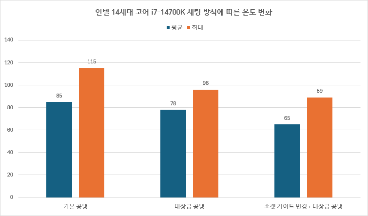 하지만 TDP 기준으로 260W 이상은 되어야 하는 14세대 코어 i7의 경우라면 풀로드 사용 환경이 자주 조성된다면 최상급 공랭 쿨러가 마지 노선이다. 언더볼팅을 더하면 살짝 여유가 생기고, 소켓 가이드까지 교체한다면 안정권에 진입한다.