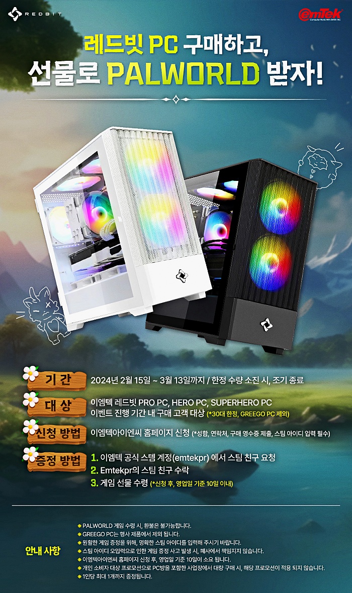 이엠텍이 오는 3월 13일까지 레드빗 PC PRO, HERO, SUPERHERO 라인업 구매 시, 스팀게임 PALWORLD 지급 행사를 진행한다. 행사 PC 제품 구매 후 이엠텍아이엔씨 공식 홈페이지에 구매증빙자료와 스팀 아이디 정보를 기재하면 이엠텍 공식 스팀 계정(emtekpr)을 선물을 수령할 수 있다.