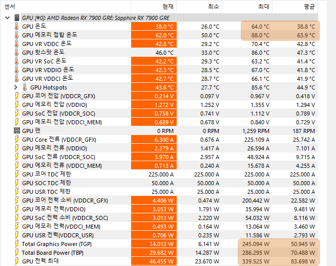 ▲ 전력 소모가 최대 339W까지 올라가지만 그럼에도 불구하고 소모량 대비 온도는 평균 38.8도로 안정된 모습이다. 3열 팬과 히트파이프 여기에 백플레이트 조합의 냉각 솔루션이 최상의 냉각 효율을 발휘한 효과다.