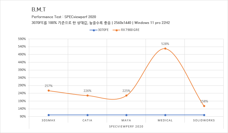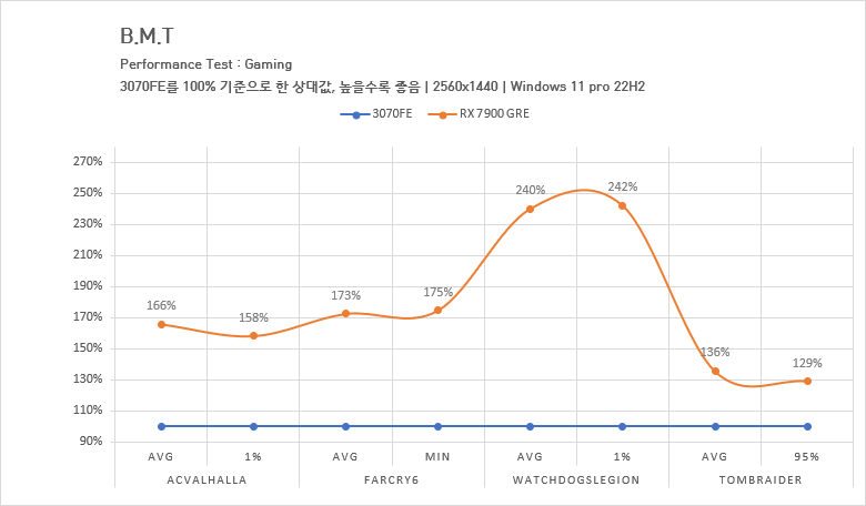 뭐 RX 7900 GRE야 이렇게 포진된 것이 조금 서러울 수 있겠지만, 대다수의 게이머들에게는 잘 된 일이다. 분명 성능 좋은 RX 7900 시리즈인데, 가성비를 앞세워 비교적 저렴하게 구입할 수 있으니까. AMD 공식 자료에 의하면 배틀그라운드 평균 FPS 기준으로는 RX 7600 XT가 168, RX 7900 GRE가 282, RX 7900 XT 20GB가 334 프레임으로 측정된다고 한다. RX 7900 GRE는 분명 RX 7900 XT에 가깝다.