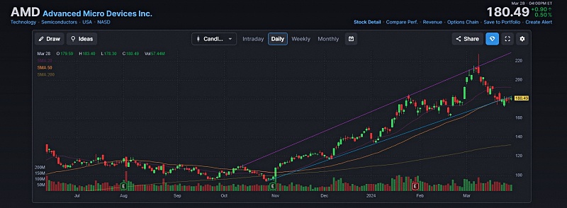 ▲ AMD의 주가 흐름. 2024년 3월 8일 이후 하락세를 보였다