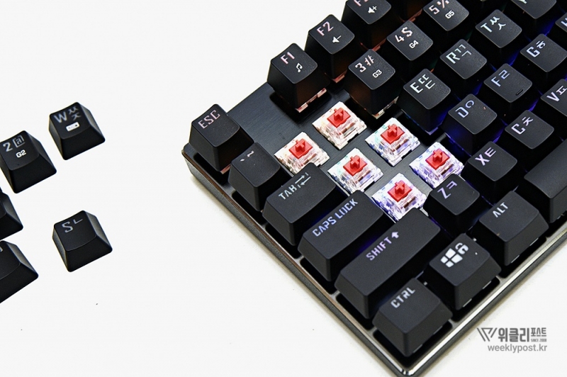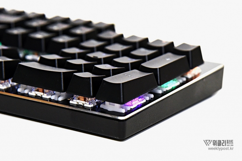 상판 위로 스위치가 장착되는 비키 스타일은 사용자에 따라 호불호가 조금은 갈리기도 한다. 글쓴이 개인적으로는 상당히 싫어하는 스타일일인데, 탄탄한 키감을 위해 알루미늄 상판을 적용하고 여분의 공간을 극단적으로 줄여 놓으니 이 스타일의 키보드 치고는 준수한 스타일로 완성된 느낌이다.