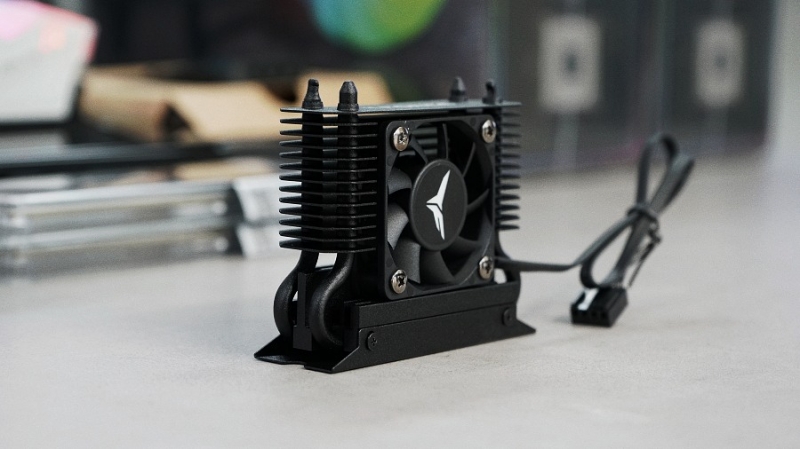 M.2 2280 규격의 Gen5 SSD는 최고 부하 시 20초 만에 70도 이상으로 온도가 상승하기에 냉각 솔루션이 필연적이다. 제품은 Gen5 스토리지에 사용 시 최대 온도를 54°C 이하로 유지하한다. 합금 이중 튜브 수랭 헤드와 이중 열전도 시트의 조합으로 SSD 컨트롤러 웨이퍼와 파티클이 구리 베이스 쿨러에 밀착해 냉각한다. 120mm 수랭 라디에이터는 13개 고밀도 알루미늄 핀으로 구성되어 있고, ARGB PWM 팬이 장착됐다.