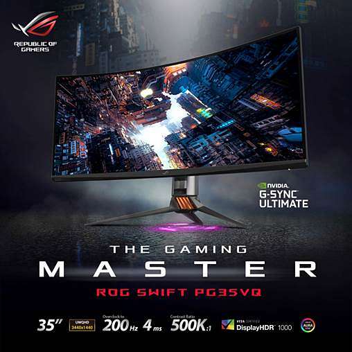 게이밍 브랜드 에이수스가 선보인 ROG Swift PG35VQ 게이밍 모니터는 35인치에 21:9 화면비율 해상도는 UWQHD(3440 x 1440)를 충족한다. 512개 구역에서 동적으로 제어되는 FALD(Full Array Local Dimming) LED 백라이트를 사용하여 전 영역에서 최대 밝기 1,000Nit를 보장하는 Display HDR 1000 인증도 획득했다. NVIDIA G-SYNC Ultimate기술로 최대 500,000:1 명암비도 구현한다.