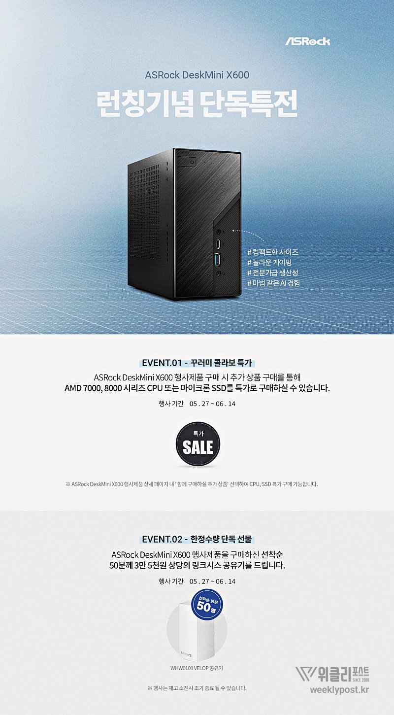 ASRock DeskMini X600 제품은 미니PC 제품으로, 컴팩트한 사이즈에 전문가급 생산성을 지녔다. 사무용, 가정용 등 다양한 환경에서 사용할 수 있다. 행사는 5월 27일부터 6월 14일까지 진행한다.