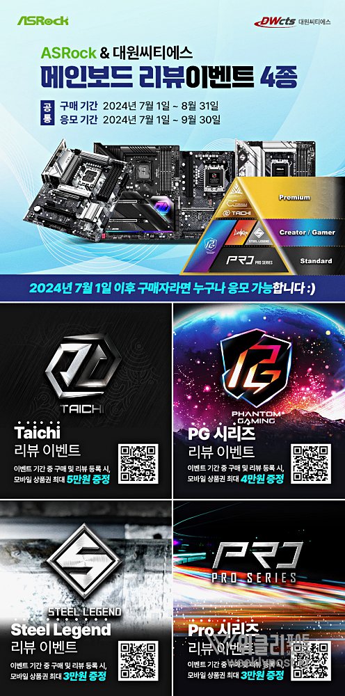2024년 7월 1일부터 8월 31일까지 기간 중 애즈락 메인보드 구매 고객이 대상이다. 애즈락 Taichi 시리즈, Phantom Gaming 시리즈, Steel Legend 시리즈, Pro 시리즈 제품구이다. 해당 기한 내 제품 구매자는 9월 30일까지 참여할 수 있으며, 리뷰 작성시 최대 5만원 상당 모바일 상품권이 주어진다.