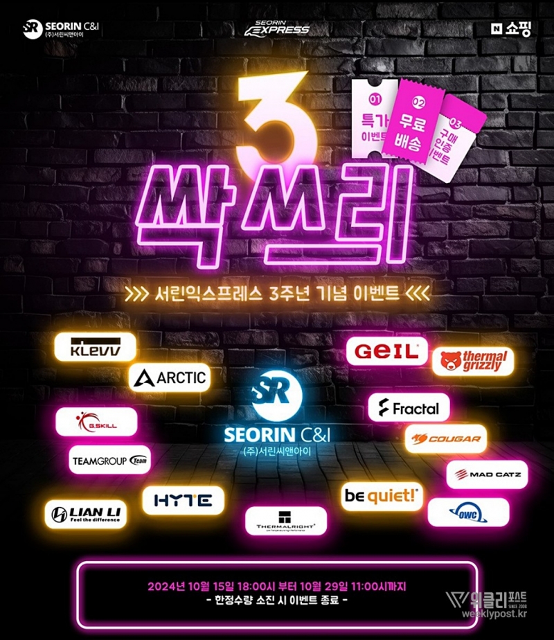 서린씨앤아이가 자사 온라인 쇼핑몰 '서린익스프레스(www.seorinexpress.com)' 운영 3주년을 맞아 특별 할인 행사를 진행한다. 서린익스프레스에는 에센코어, 지스킬, 게일, 팀그룹, 리안리, 프렉탈디자인, 하이트, 쿠거, 비콰이어트, 서멀라이트 등 세계적인 PC 하드웨어 브랜드가 입점해있다.