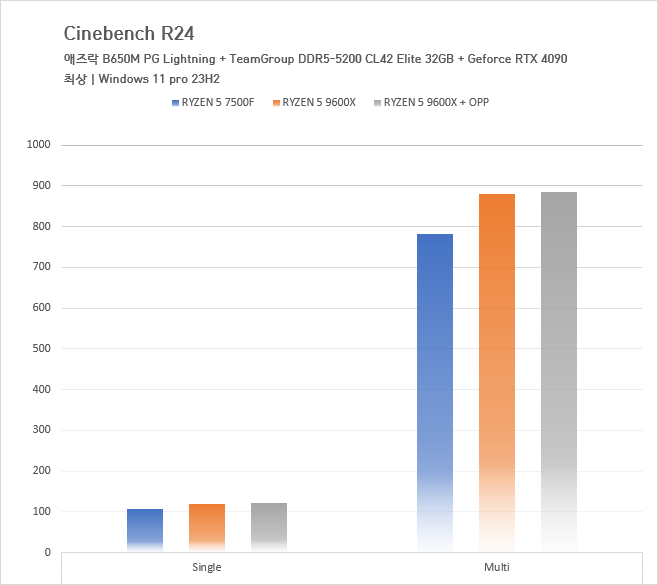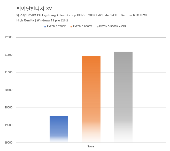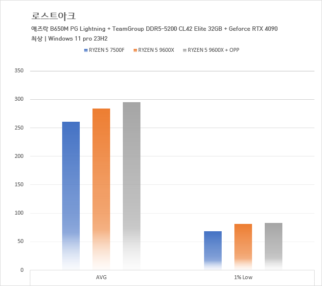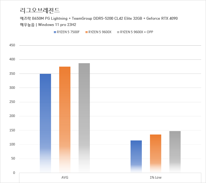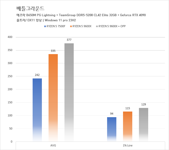 OPP 설정은 Ryzen 5 9600X와 같은 메인스트림급 CPU에서 성능을 극대화하는 데 매우 효과적이다. 특히 PUBG와 같은 고사양 하드웨어를 요구하는 게임에서 약 12% 이상의 프레임 향상이 관측되었으며, 이로 인한 효과라면 게임 플레이의 부드러움 개선이랄까!