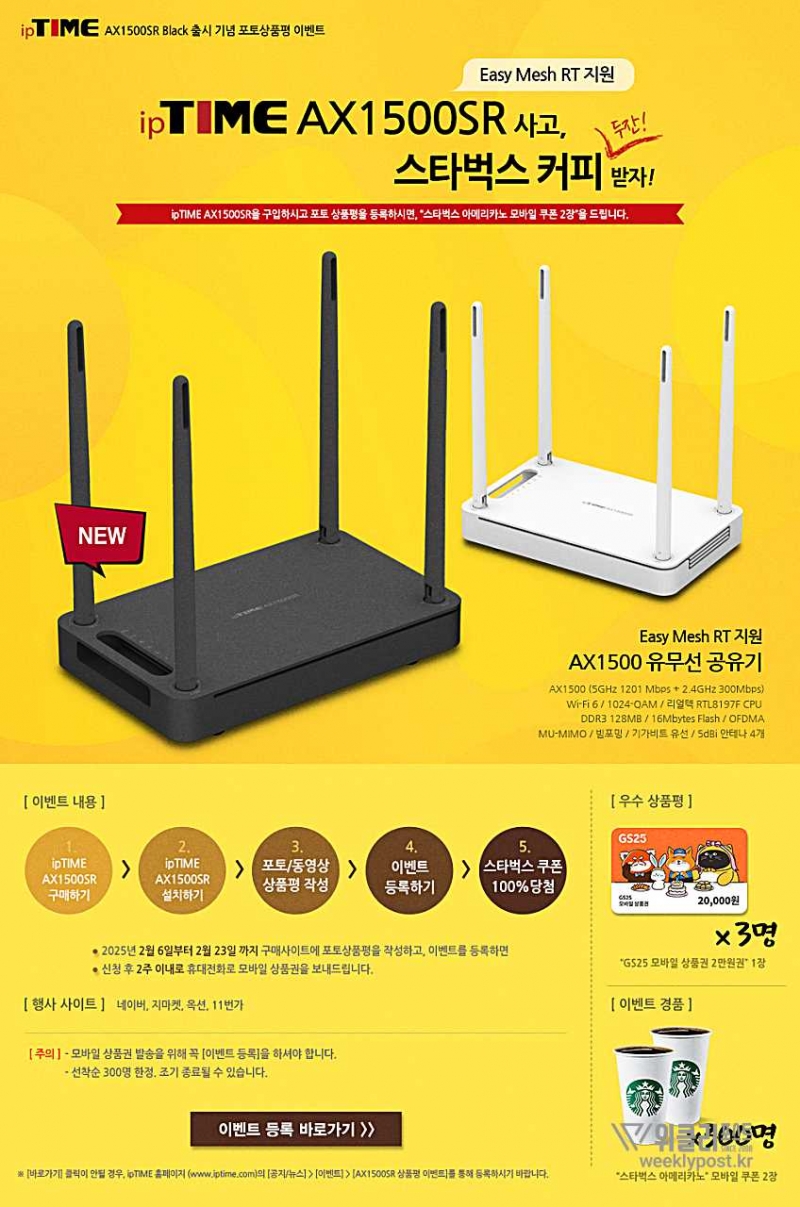 AX1500SR 블랙 버전 출시를 기념해 포토 상품평 이벤트가 진행된다. 제품 색상과 관계없이 AX1500SR을 구매한 소비자는 이벤트에 참여할 수 있으며, 포토 리뷰 작성자 300명에게 아메리카노 쿠폰 2장이 제공된다. 또한, 우수 리뷰 작성자 3명에게는 GS25 모바일 상품권(2만 원권)이 추가 증정된다.