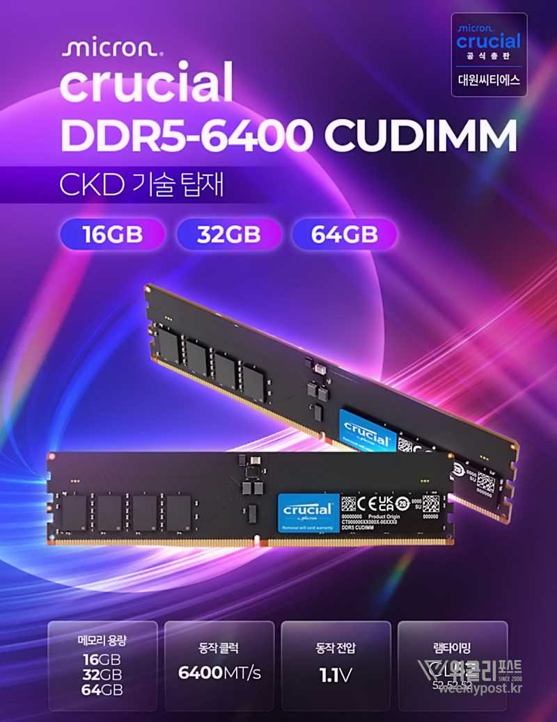 대원씨티에스가 마이크론 Crucial DDR5-6400 CUDIMM 메모리를 국내 시장에 공식 출시했다. 신제품은 16GB, 32GB, 64GB 세 가지 용량으로 구성되며, 인텔 2세대 코어 울트라(Arrow Lake 아키텍처)를 비롯한 최신 플랫폼에 최적화돼 고성능 게이밍, 콘텐츠 제작, AI 연산 등 다양한 환경에서 안정적인 성능을 제공한다.