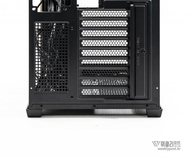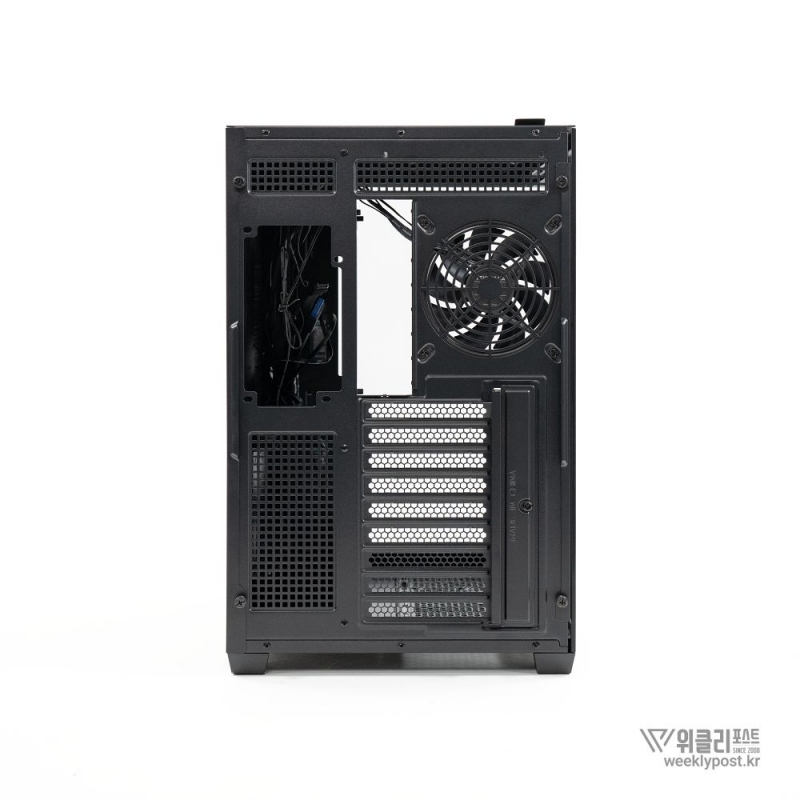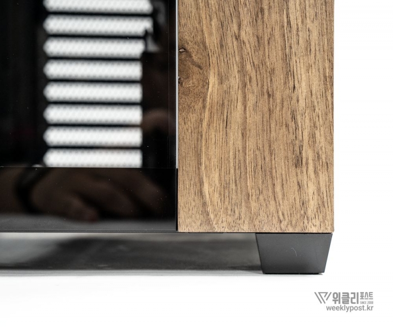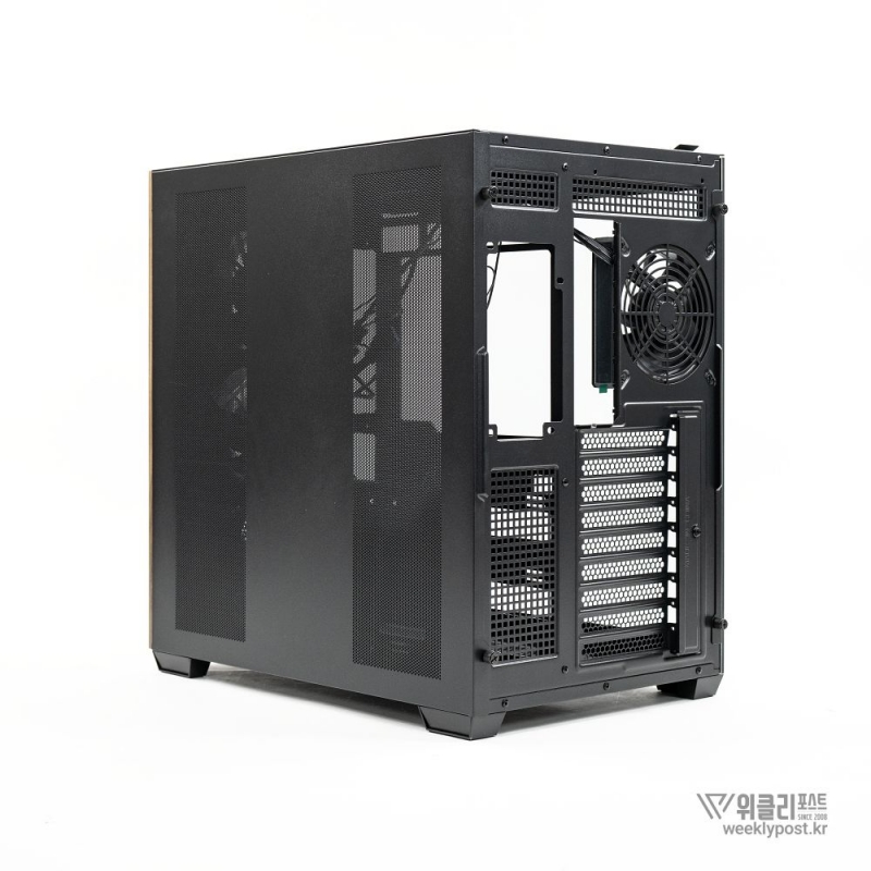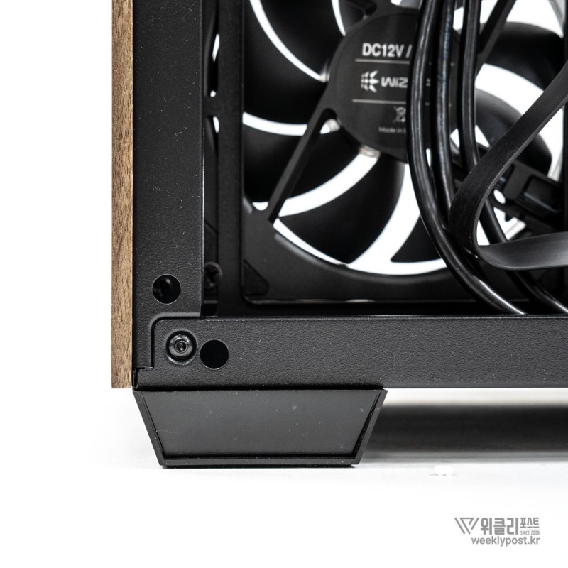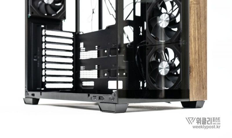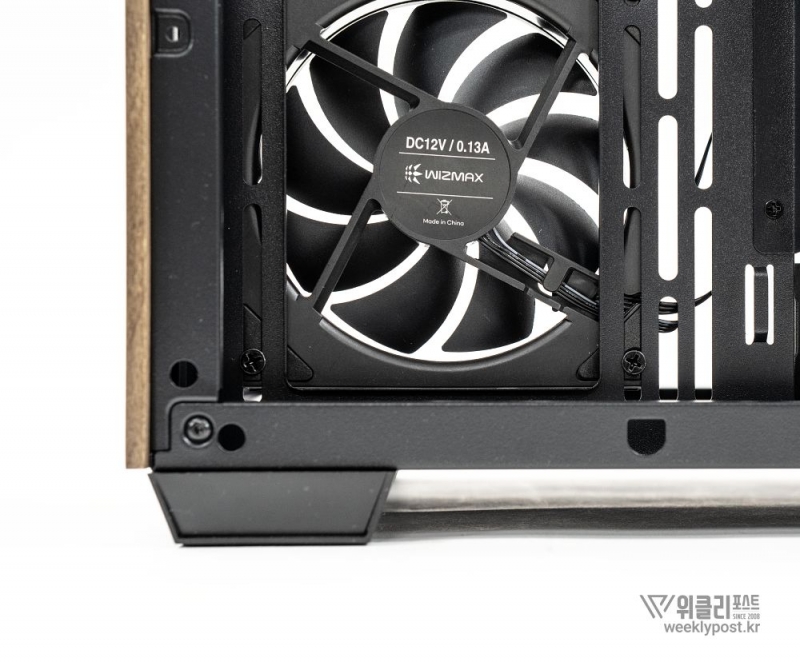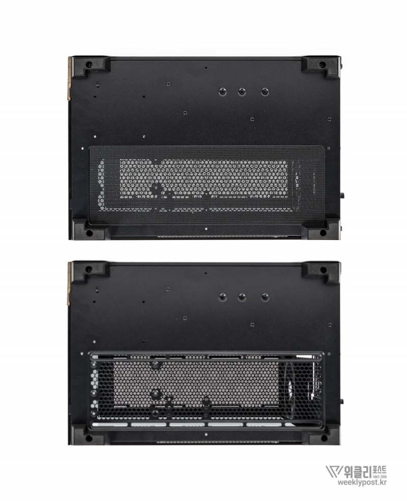 흔히 어항형 케이스는 보기에 좋아도 공기 흐름 구성은 어려운 경우가 많다. 열 배출이 제한적이기 때문이다. 마이크로닉스는 이 부분을 고려해 위즈맥스 우드리안 맥스 측면부에 통풍구를 내었다. 케이스 측면 패널에는 듀얼 에어홀 설계를 적용해 파워서플라이의 발열과 주 공간의 열배출이 가능하게 설계했다. 후면부 곳곳에도 열 배출을 위한 타공 처리가 되어 있어 안정적인 공기 흐름을 구성할 수 있다.