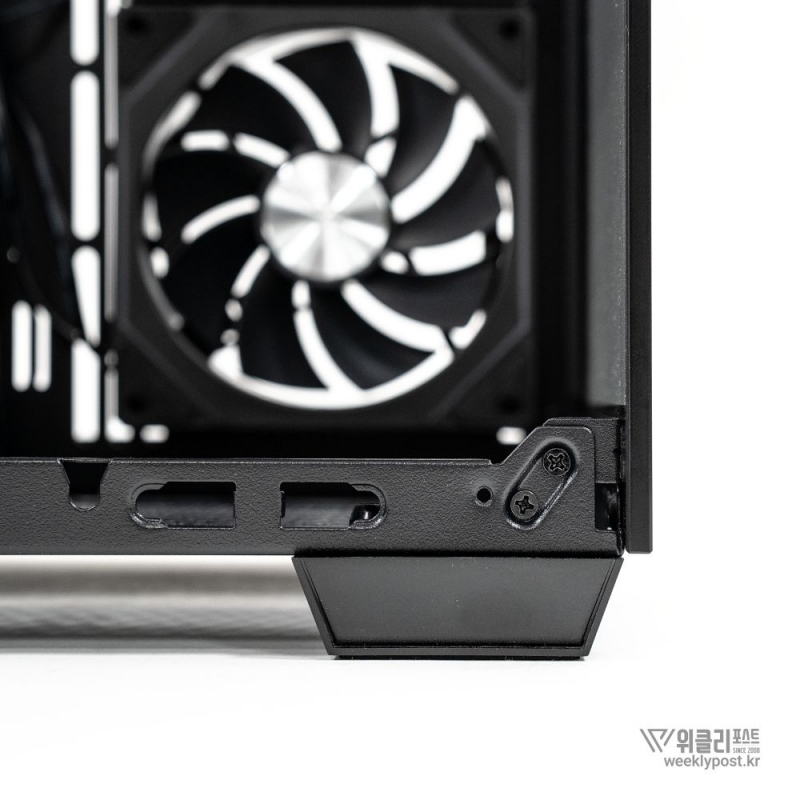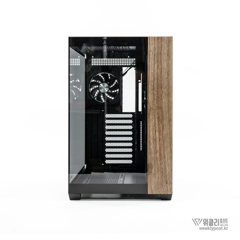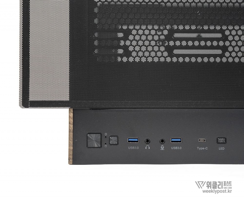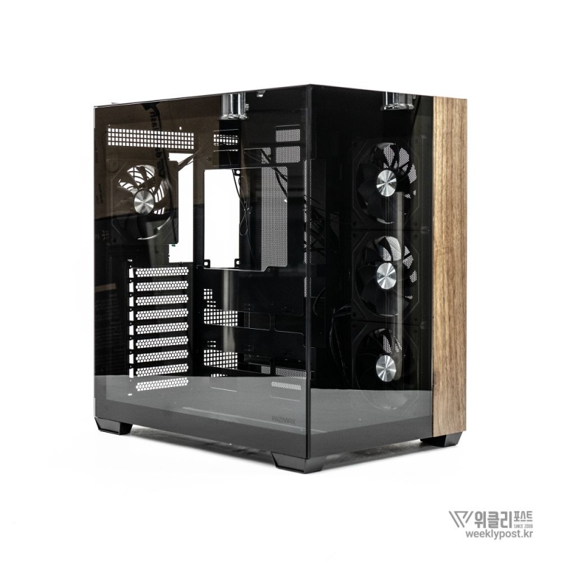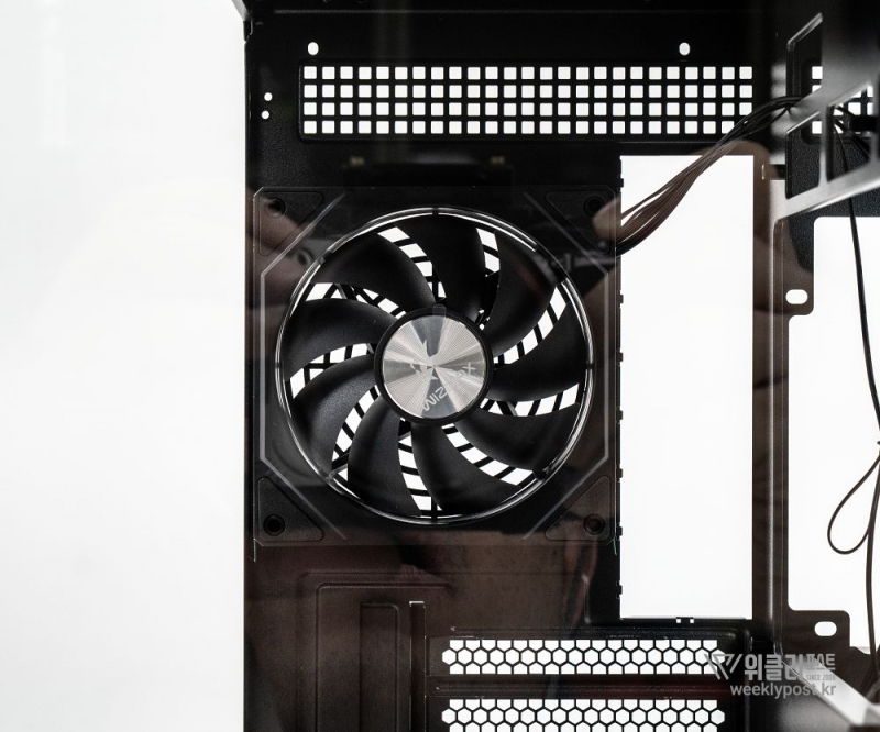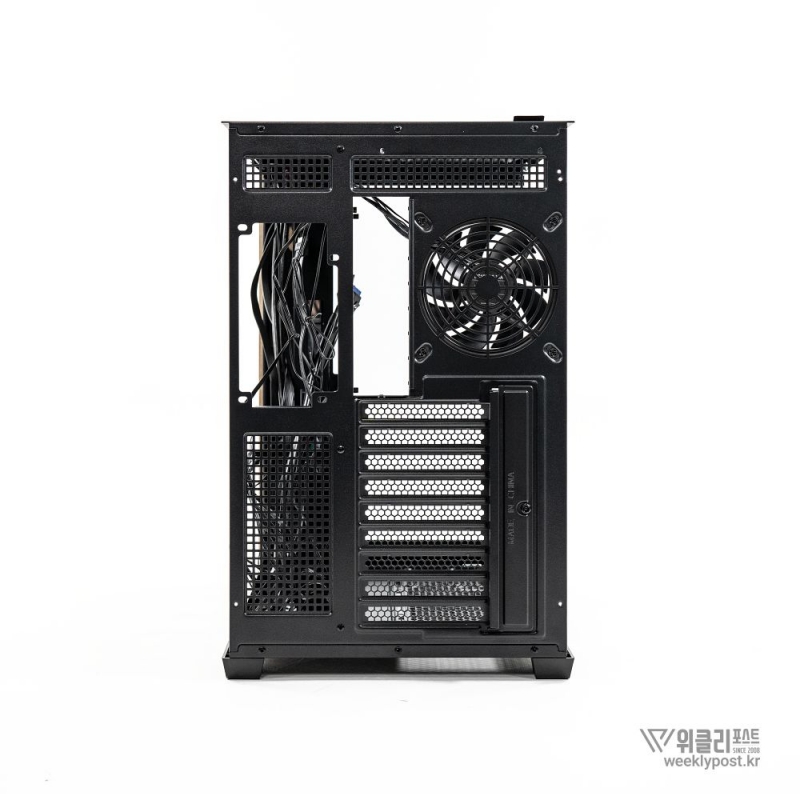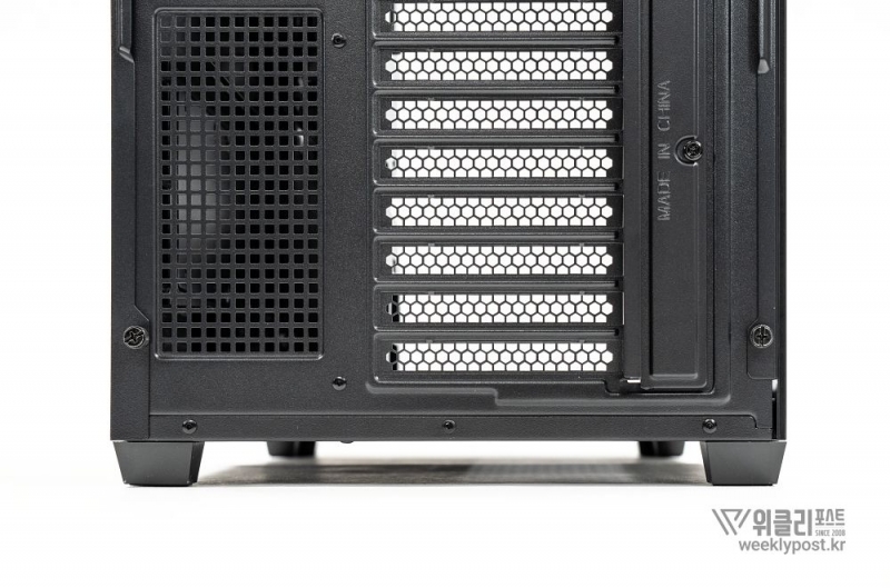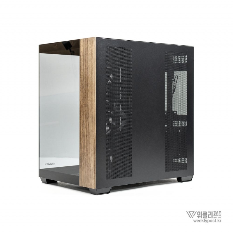 흔히 어항형 케이스는 보기에 좋아도 공기 흐름 구성은 어려운 경우가 많다. 열 배출이 제한적이기 때문이다. 마이크로닉스는 이 부분을 고려해 위즈맥스 우드리안 맥스 측면부에 통풍구를 내었다. 케이스 측면 패널에는 듀얼 에어홀 설계를 적용해 파워서플라이의 발열과 주 공간의 열배출이 가능하게 설계했다. 후면부 곳곳에도 열 배출을 위한 타공 처리가 되어 있어 안정적인 공기 흐름을 구성할 수 있다.